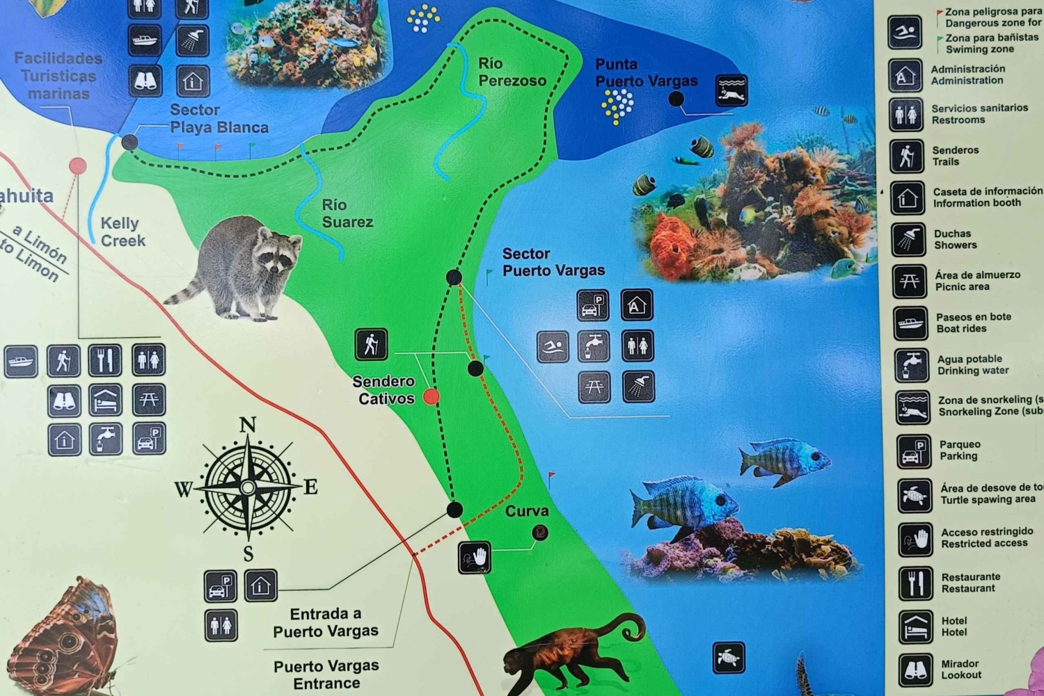 Sea-Land Combo, som det er kendt, ville være : Først 2 timers snorkling i Cahuita National Park, hvor vi besøger den største koralplatform i Central- og Sydamerika efter Belize med 600 marine hektar. Inklusive alt udstyr: båd, maske, tube, speciel flyder, hvis du ikke er en god svømmer, svømmefødder samt en snack med tropisk frugt efter snorkelaktiviteten. Lige derefter sætter båden dig af i River Suarez-området, hvor en lokal certificeret guide venter på at starte den 2 timers guidede vandretur gennem nationalparken Cahuita med dens High Definition-teleskop, der viser og forklarer om dyrelivet i parken samt lægeplanter, kultur og historie i Cahuita, og efterlader dig i byen efter alt.Includes
