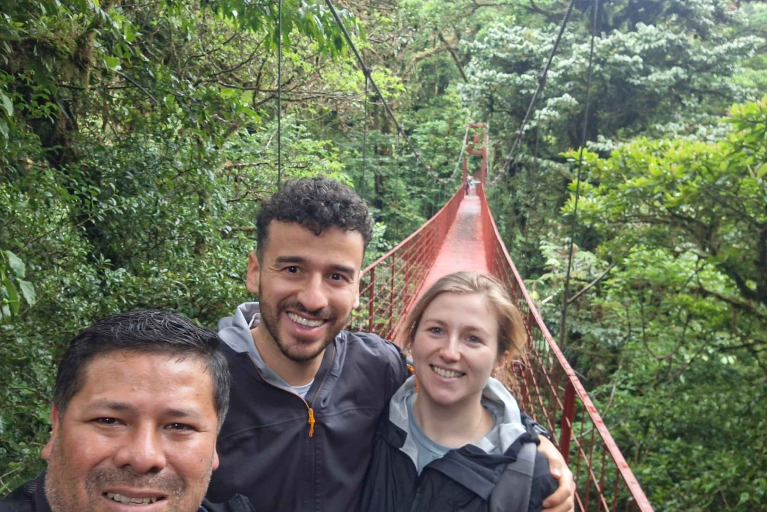 Bevor wir losgehen, treffen wir uns 20 Minuten vorher an der Rezeption des Nebelwaldes von Monteverde. Die Tour dauert ungefähr 2 Stunden. Ein paar Tipps: - Nimm Insektenschutzmittel mit - Jacke oder Poncho - Wasserdichte Schuhe - ❌ Der Preis beinhaltet nicht den Eintritt in das Nebelwaldreservat von Monteverde. Anschließend geht es in den Nebelwald von Monteverde, eines der artenreichsten Ökosysteme der Welt, in dem Tausende von Pflanzen- und Tierarten beheimatet sind. Mit seinem kühlen, nebligen Klima und seiner üppigen Schönheit ist er das perfekte Ziel für Natur- und Abenteuerliebhaber. Die geführte Tour durch den Nebelwald ist ein faszinierender Spaziergang auf Pfaden voller Artenvielfalt, auf denen du eine unglaubliche Vielfalt an Flora und Fauna entdecken und kennenlernen kannst, was ihn zu einem der faszinierendsten Reiseziele Costa Ricas macht. In Monteverde gibt's etwa 520 Orchideenarten, von denen viele endemisch sind, sowie eine große Vielfalt an Moosen und Flechten, die die Bäume bedecken und eine mystische Atmosphäre schaffen. Auch Bromelien und Farne sind reichlich vorhanden und bereichern die Artenvielfalt der Region. Was die Tierwelt betrifft, ist das Reservat bekannt als Heimat des Quetzals, eines ikonischen Vogels Mittelamerikas, sowie anderer Arten wie Kolibris, Trogone und Tukane. Zu den Säugetieren, die den Nebelwald bewohnen, gehören Nasenbären, Agutis, Brüllaffen, Weißgesichtkapuziner und Klammeraffen. Außerdem kann man eine große Vielfalt an Reptilien und Amphibien beobachten. Darüber hinaus beherbergt das Reservat eine reiche Vielfalt an Insekten, von bunten Schmetterlingen bis hin zu Käfern und Spinnen. Auf den gut gepflegten Wanderwegen kann man verschiedene Ökosysteme erkunden und dabei den Panoramablick auf die bergige Landschaft und den umliegenden tropischen Dschungel genießen. Das Reservat ist nicht nur ein idealer Ort für Naturliebhaber, sondern auch ein wichtiges Schutzgebiet für die weltweite Artenvielfalt.Includes