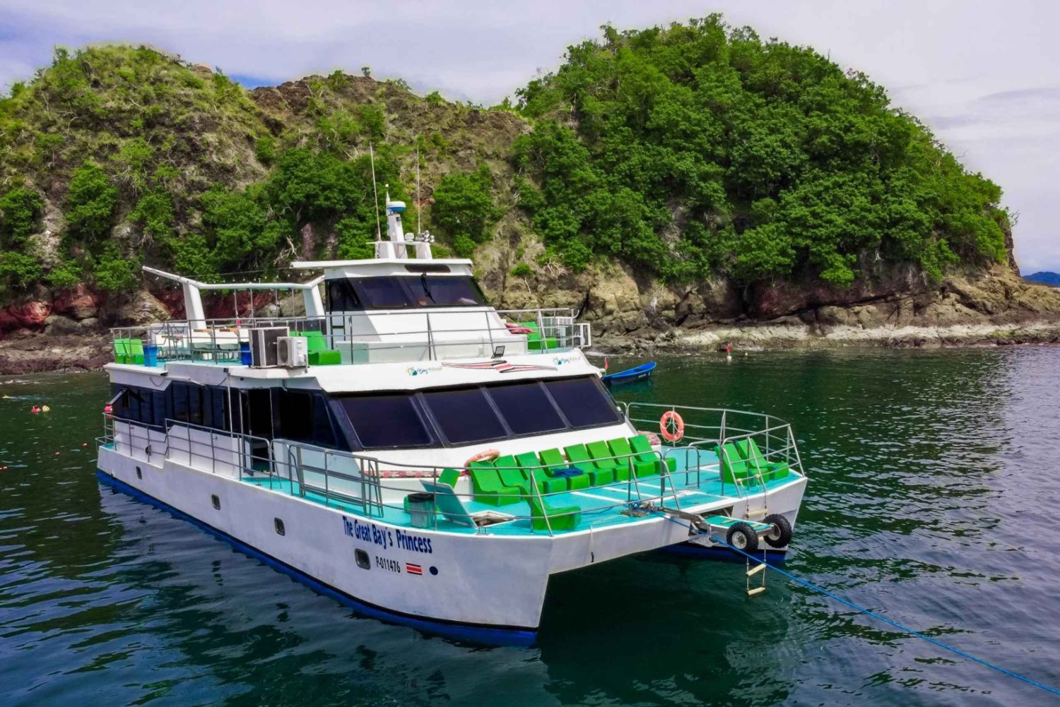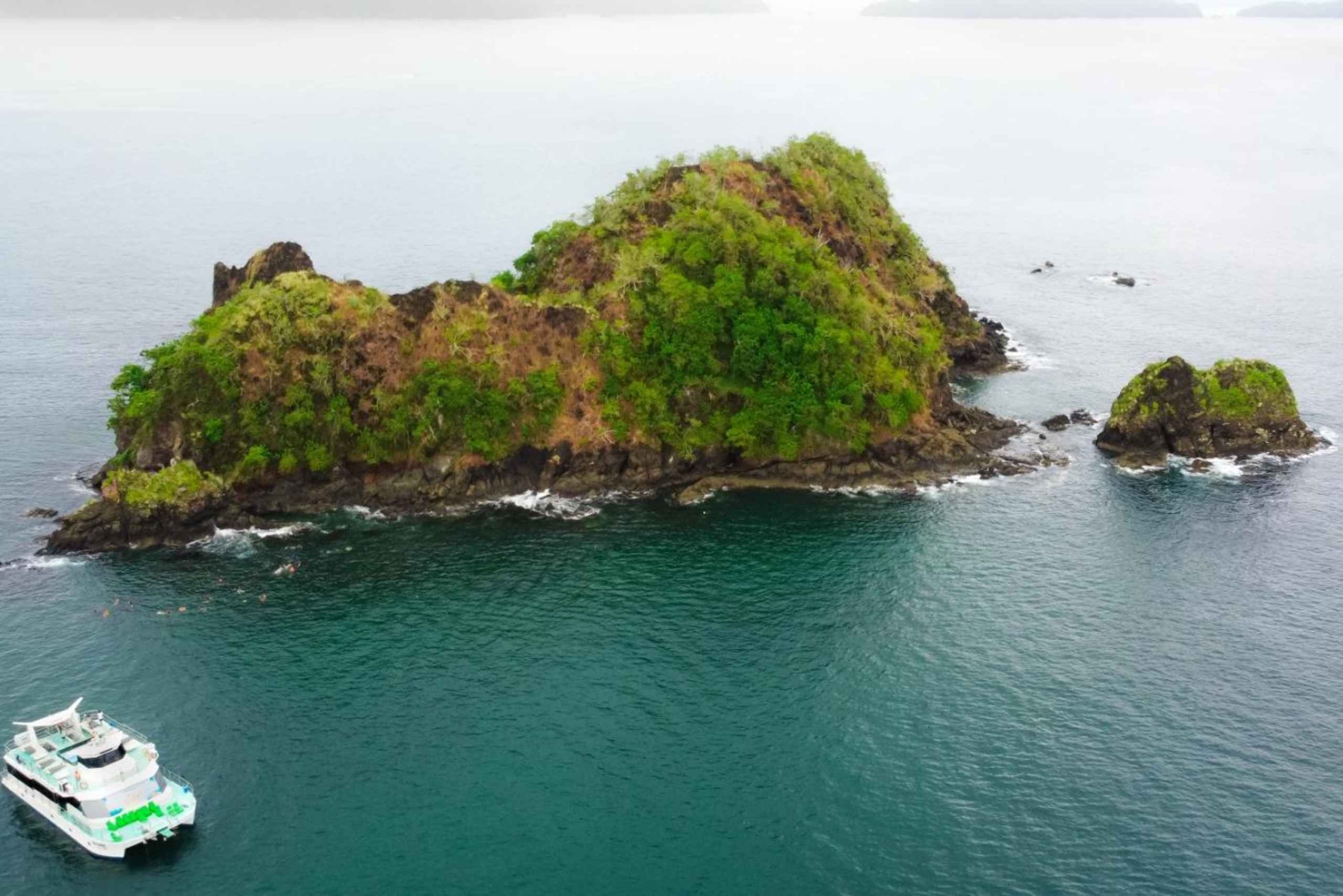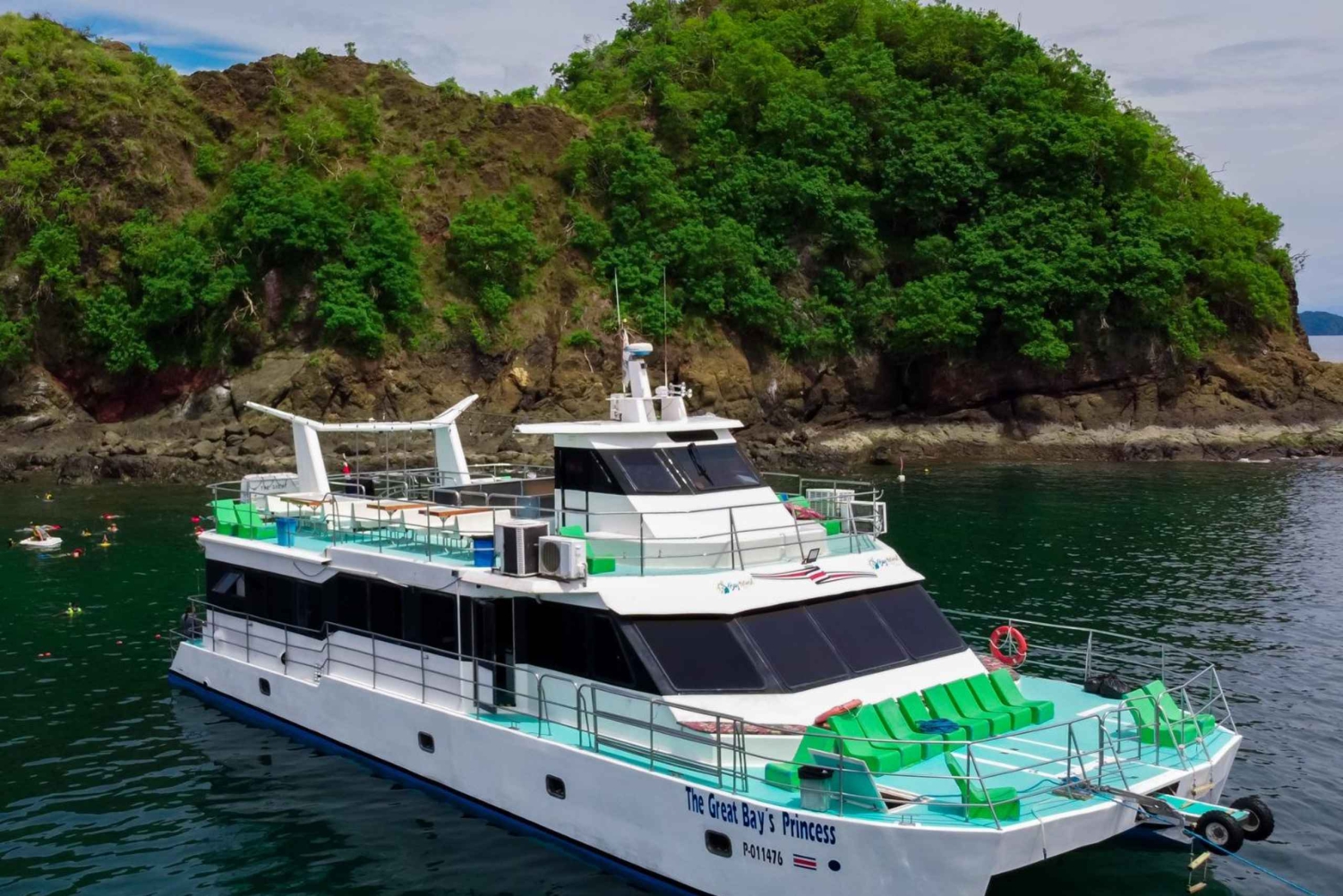 Descubre la magia de una isla de ensueño, Isla Tortuga. Situada en el Golfo de Nicoya, a 12 millas náuticas de Puntarenas, Isla Tortuga (llamada Tolinga por los indígenas) tiene una superficie de 120 hectáreas y se mantiene como bosque protegido; goza de la Bandera Azul Ecológica desde hace más de cinco años. Esta distinción se concede a las playas de nuestro país que tienen aguas libres de contaminación. Debido a su característica geográfica, sus aguas son de color turquesa y resultan óptimas para el baño. Durante tu estancia en la isla, podrás disfrutar y adquirir actividades extra, como snorkel, banana, kayak, entre otras..Includes