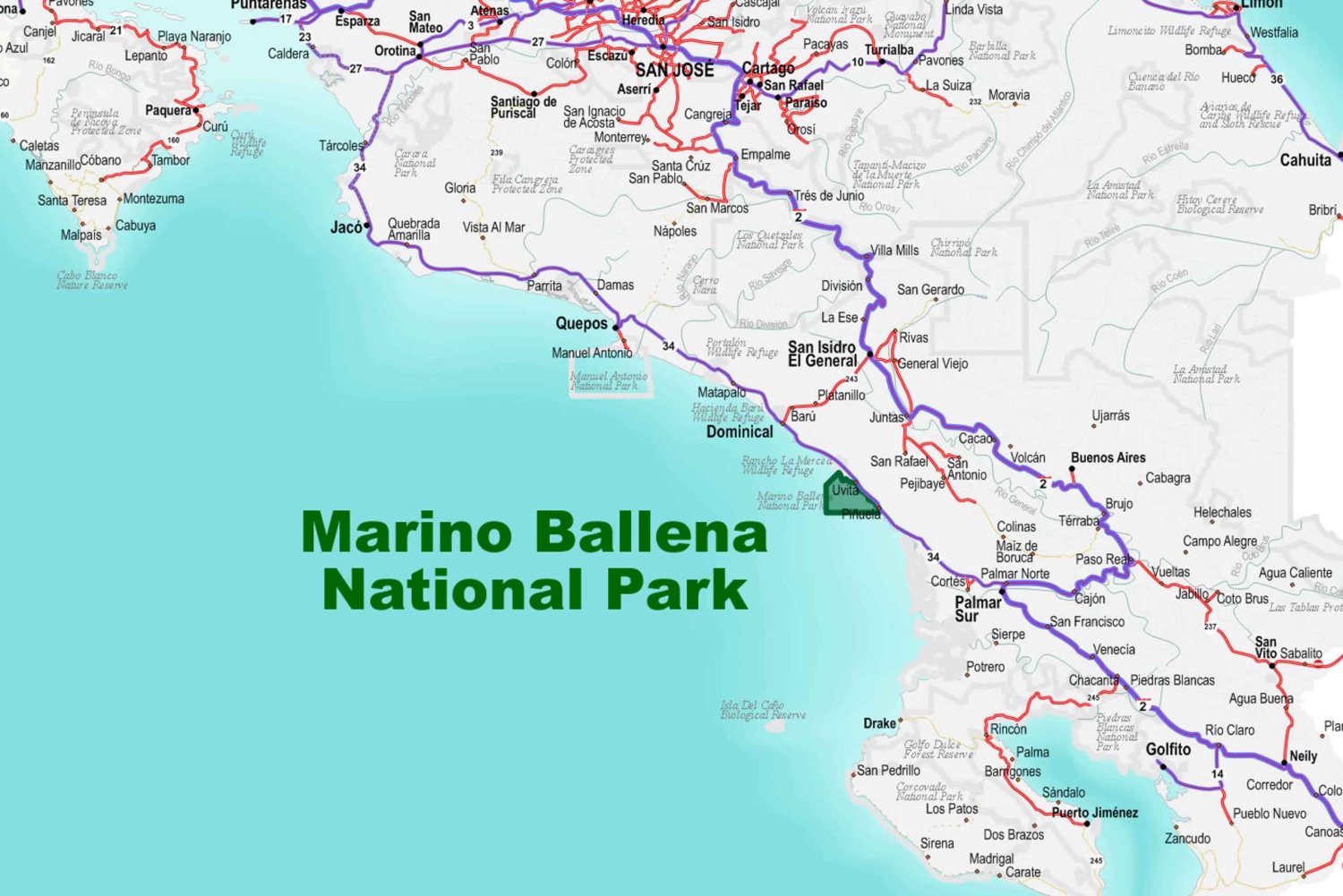 Situado en la costa del Pacífico Central, al sur de Puntarenas, el Parque Nacional Marino Ballena protege más de 13.000 acres de océano y 9 millas de costa. Compuesto por bosques de manglares, arrecifes de coral y playas vírgenes, el parque nacional es ideal para los viajeros que deseen contemplar la frágil vida salvaje mientras escapan del ajetreo de la vida cotidiana. En el Parque Nacional Marino Ballena viven muchas especies, como monos aulladores, perezosos, monos capuchinos de cara blanca, guacamayos rojos, ardillas, tucanes, garzas, iguanas, cocodrilos, nutrias y muchas más. El parque debe su nombre a las ballenas jorobadas que migran a la región de agosto a noviembre (en dirección norte desde la Antártida) y de diciembre a abril (en dirección sur desde Alaska), cada año. Dado que la migración de las ballenas se produce durante gran parte del año, es un lugar estupendo para ir a observarlas. La zona fue declarada parque nacional en 1989 para proteger a las criaturas que migran hasta aquí para reproducirse y alimentarse. ¡Incluso la forma de la zona desde arriba parece la aleta de una ballena! El Parque Nacional Marino de Ballena abarca 110 hectáreas de tierra y 5.375 hectáreas de mar. Hay aproximadamente 85 especies endémicas en las aguas de esta zona.Includes