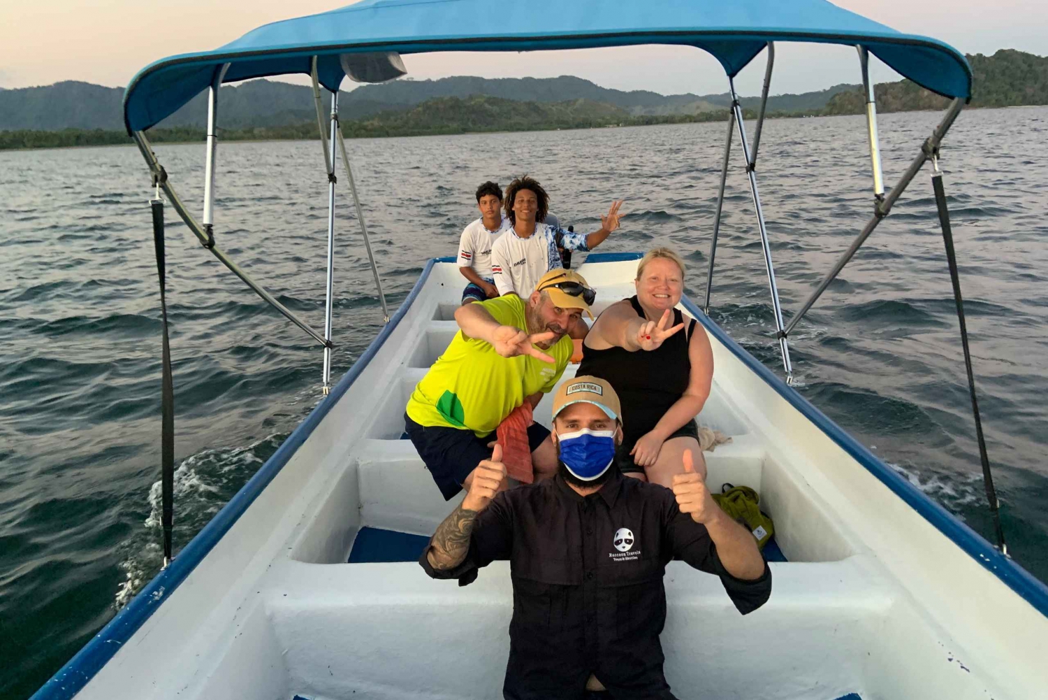 Imagine yourself at night, swimming immersed, snorkeling in the bioluminescent beach where plankton fills the ocean in blue and green glows, Bioluminescent water tour where you will feel like you are living a fairy tale in person. Our tour begins 5:50pm at the Pochote mangrove, where we will board the boat and take a tour of the mangroves forest (it depends of the tide) and you will have the opportunity to observe various species of animals, including hummingbirds, birds, raccoons, and other types of wildlife. Proceed to the center of Drum Whale Bay, where you will be able to see the most important sites in the area and learn about the seasonal visit of cetaceans to our bay. We will also talk about the culture of our Tambor town and the local fishermen in our area. You will visit Playa Muertos Pochote, a white sand beach with no waves, making it super safe to swim in the transparent waters you will have the opportunity to enjoy fresh fruits, water, natural drinks, snacks, and to enjoy the sunset. Finally you will take the boat again at nightfall to search for the best point of bioluminescence concentration for 40 minutes of snorkeling in the glowing water.Includes