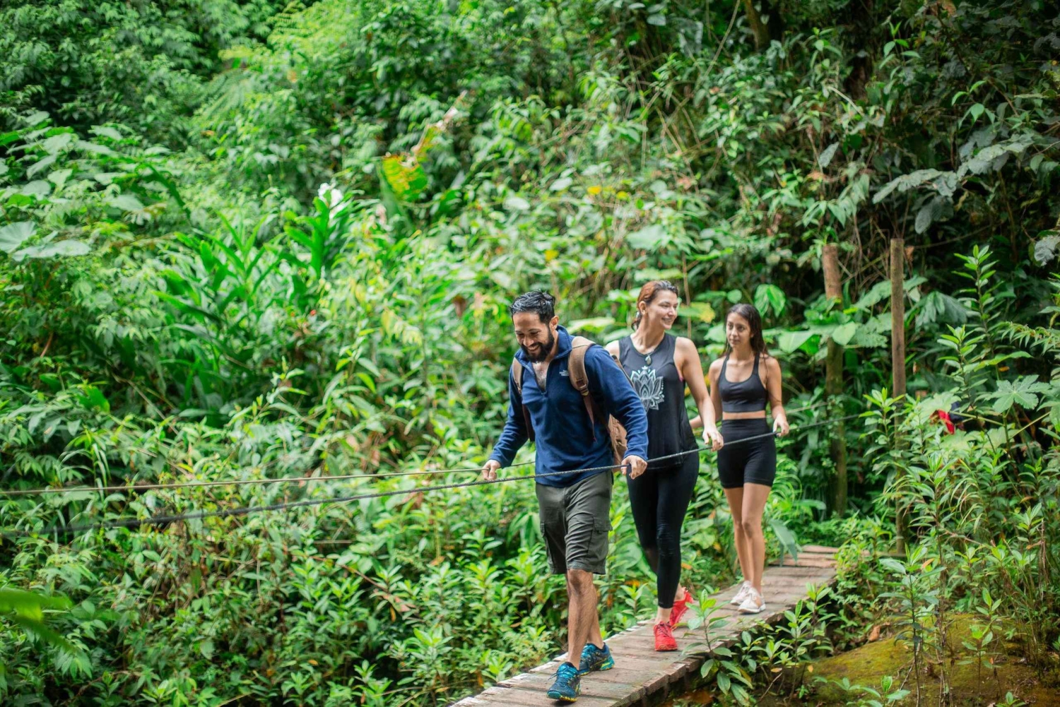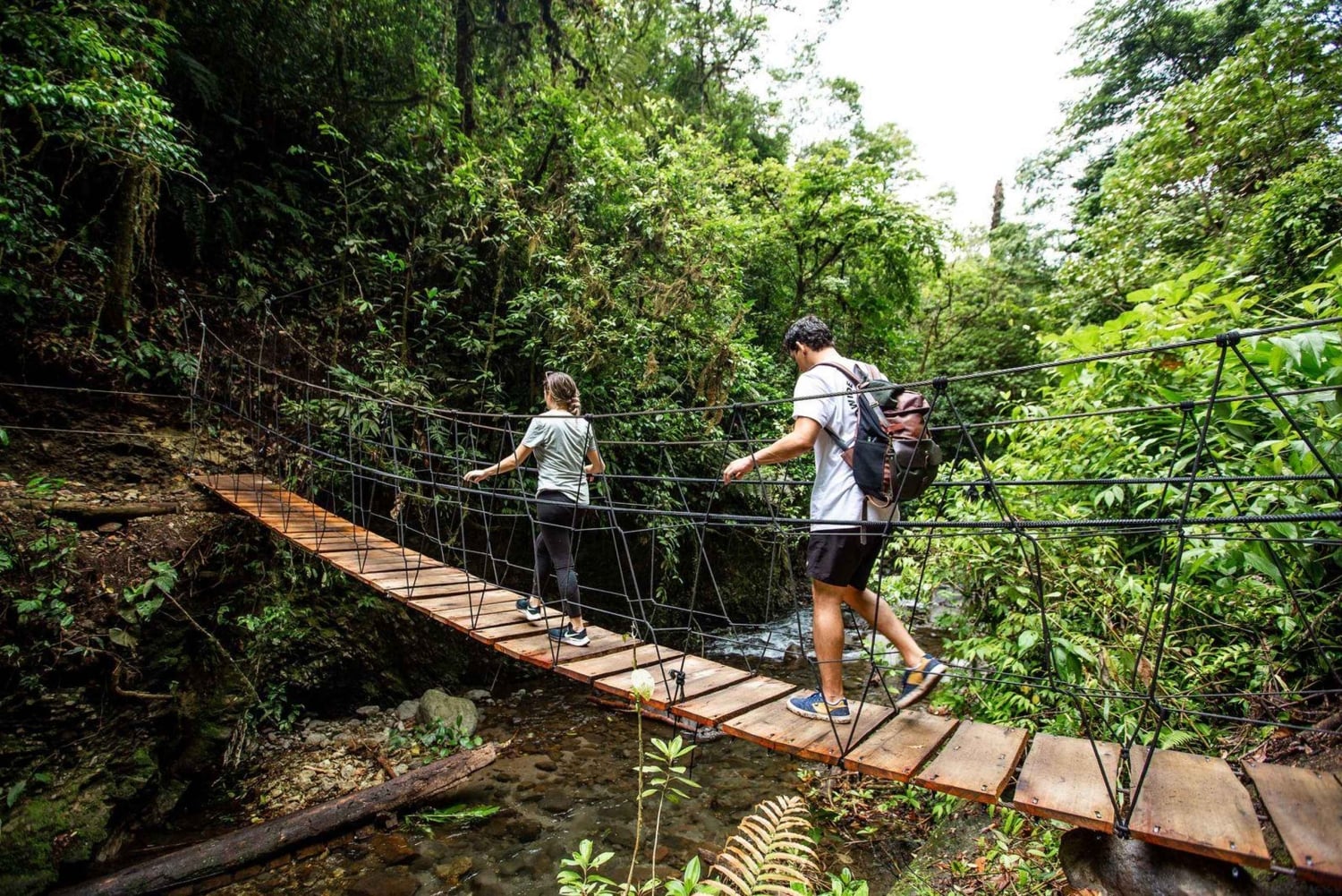 Begin your adventure with hotel pick-up in Monteverde and arrival at the reception area, where you can enjoy a coffee and prepare for your hike. Set off on a self-guided hike with a detailed map and safety tips, allowing you to explore at your own pace. Discover 4 breathtaking waterfalls, 10 rustic bridges (including hanging bridges), and natural river pools for swimming. On the final uphill section, choose between a 35-minute horseback ride (no experience needed, weight limit 110 kg / 250 lbs) or a 4x4 safari vehicle. Finish with a hearty typical lunch, including vegetarian and vegan options, at a restaurant with panoramic views.Includes
