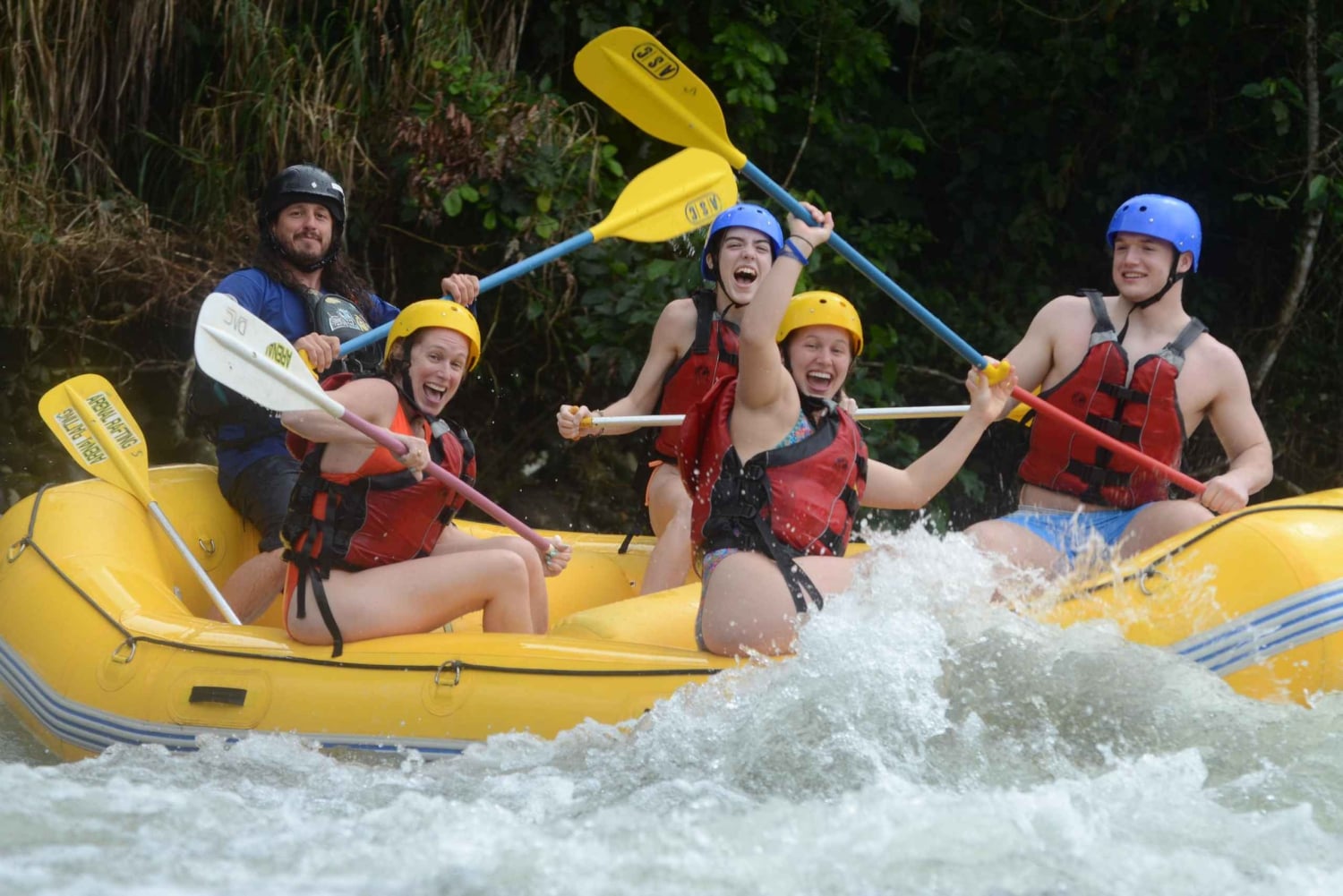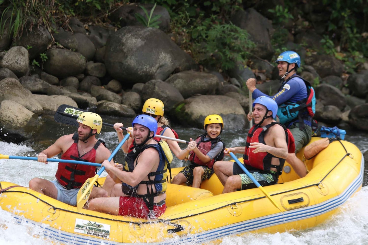 Experience the thrill of white water rafting on the Rio Sarapiqui. Enjoy a fun-filled day with your family and friends and take advantage of the morning for another activity. Begin your adventure with a pick-up from your hotel in La Fortuna or at the local operator's office. Then, drive in a modern and comfortable bus with AC for about one hour to reach the Rio Sarapiqui. Upon reaching the Rio Sarapiqui, get dressed in your gear, including a lifejacket, helmet, and paddle. Listen to a full safety talk to ensure you enjoy a safe experience. Your guides are bilingual, certified, and have a minimum of 5 years of experience. After the safety speech, do a little practice, and start the descent of the rapids with 2 hours to down a section of 10 kilometers with an average of 25 rapids, full of fun waves and big splashes. On the way, stop to enjoy some seasonal fruit like pineapples, watermelons, or mangos, and rest at a nice spot on the river side. As an optional activity, stop at a place where you can jump from a cliff, not too high and deep enough, where the guides will give you tips and secure measures to be safe. During the tour, see a diversity of wildlife, as well as wonderful scenes of dense vegetation and landscapes. The water is clear and the temperature is perfect for swimming. At the end of the tour, the driver waits for you at the take-out point, with the bus, water, and towels. Enjoy tropical fruit, Costa Rican snacks, and coffee, and observe the funny photographs of yourself on the rapids. After enjoying some fruit and Costa Rican snacks, be taken back to your hotel in La Fortuna.Includes