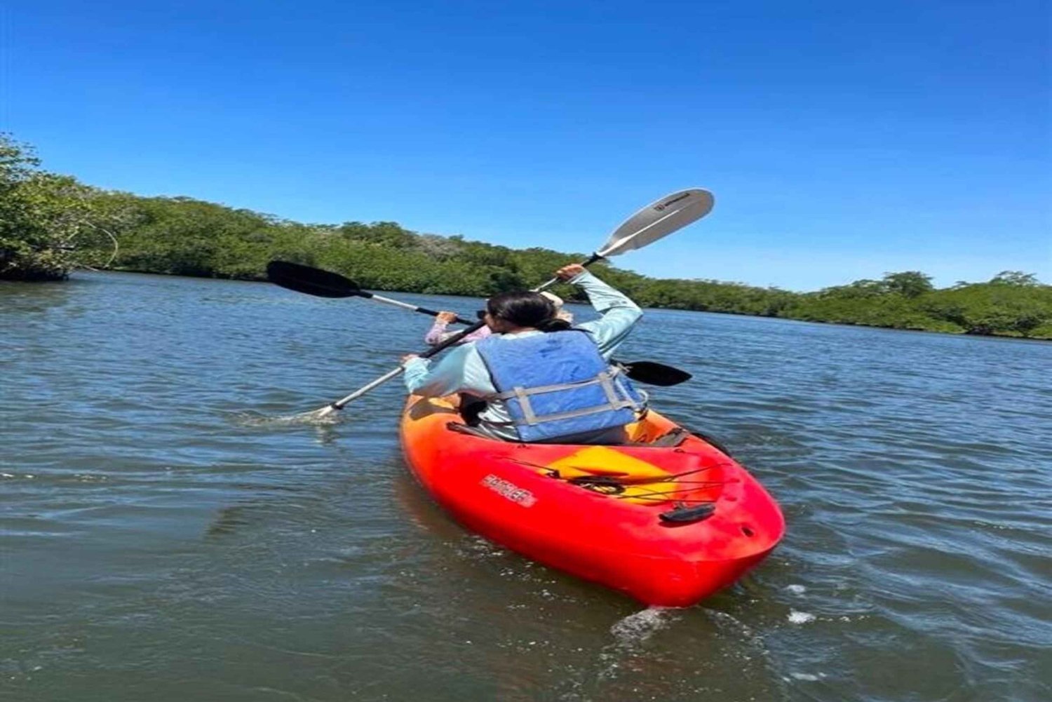 Inizia la tua avventura nell'Estero di Tamarindo scegliendo tra kayak o barca. Se scegli il kayak, ti muoverai silenziosamente tra le mangrovie e i canali nascosti, avvicinandoti agli uccelli e alla fauna locale senza disturbare l'ambiente. Se scegli la barca, navigherai attraverso canali più ampi, godendoti viste panoramiche delle mangrovie e osservando da vicino uccelli e altre specie. Durante il tour, ci fermiamo per una passeggiata, dove puoi vedere le scimmie e imparare sull'ecosistema, la flora e la fauna del Parco Nazionale Marino Las Baulas, tutto questo con una guida esperta. L'attività unisce natura, apprendimento e avventura, offrendo momenti perfetti per scattare foto e connettersi con l'ambiente. Alla fine del tour, tornerai al punto di partenza con i ricordi di un'esperienza ecologica unica, ideale da vivere in famiglia o con gli amici, e per chi cerca tranquillità e contatto diretto con la natura in un ambiente protetto.Includes