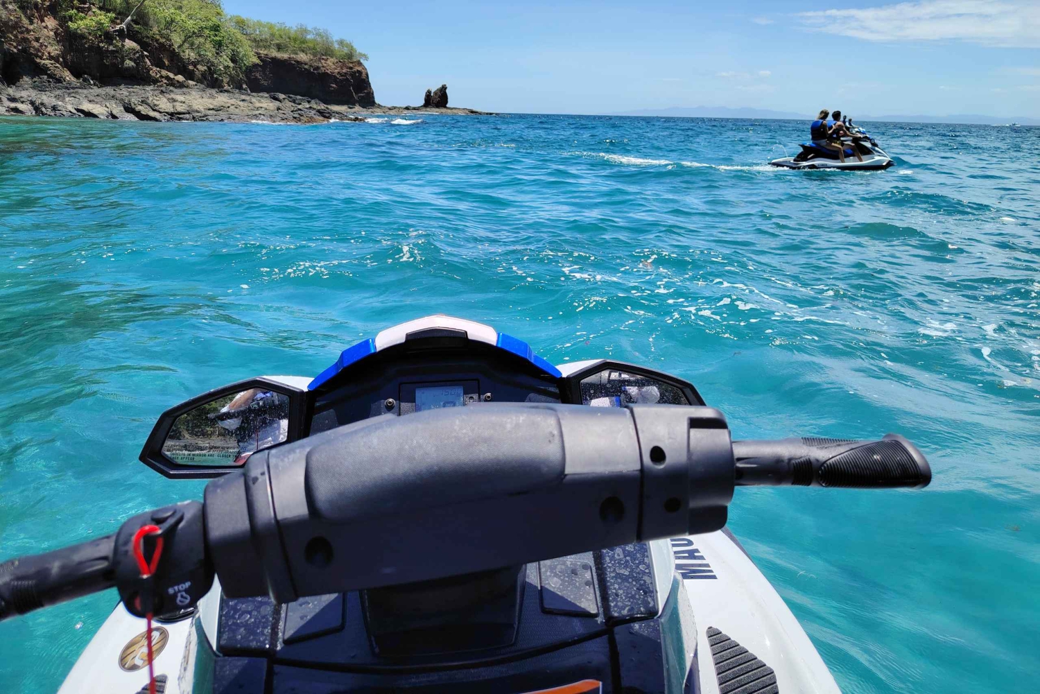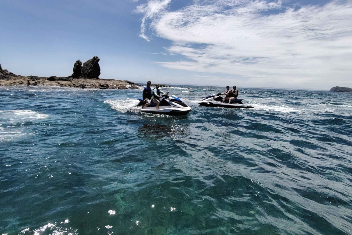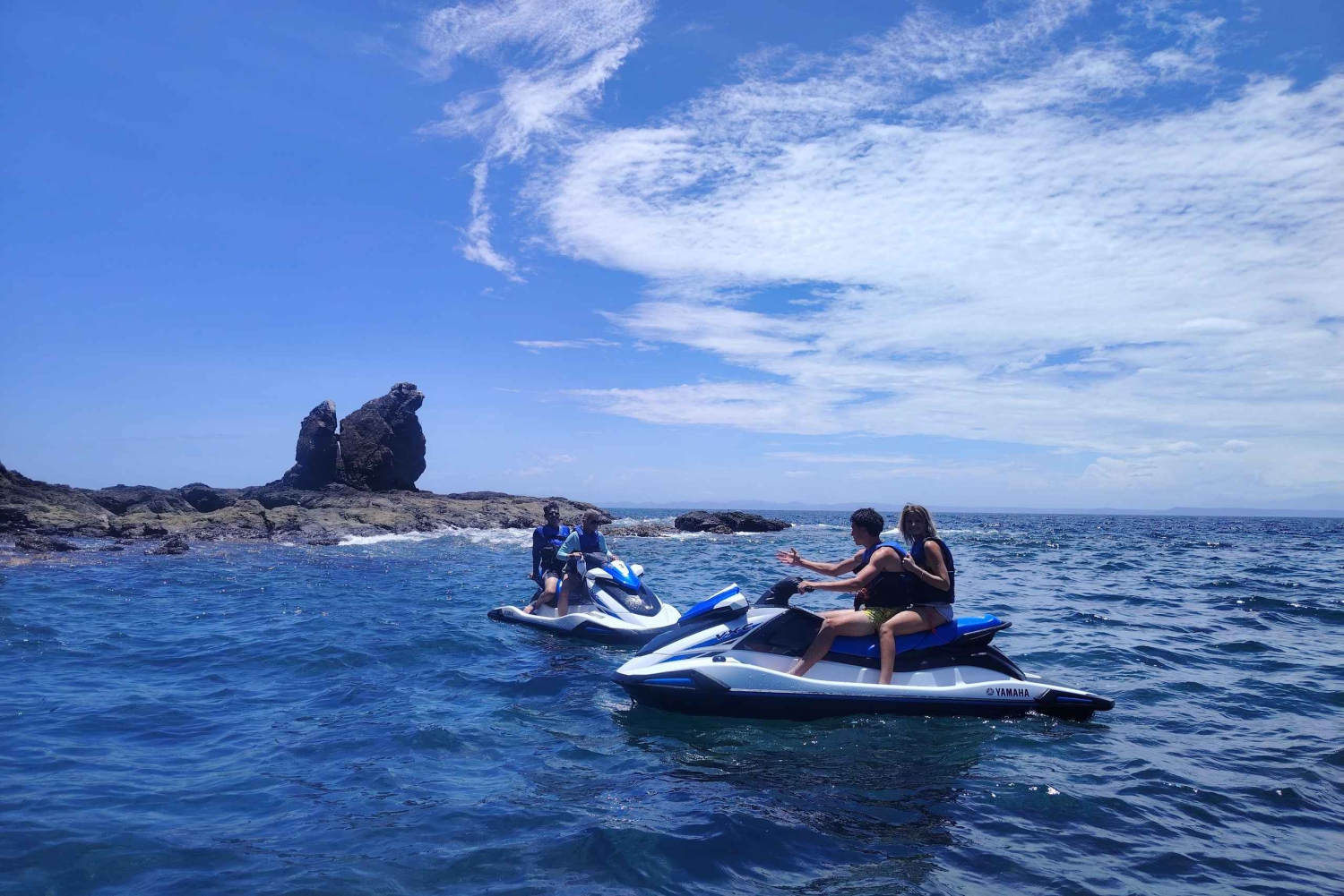 グアナカステ海岸沿いを、プラヤ・ココからプラヤ・パナマまで、プレミアムヤマハジェットスキーで疾走します。隠れた湾、海洞、火山島を探索し、クエレブラ湾の透明な海でスノーケリングをお楽しみください。
