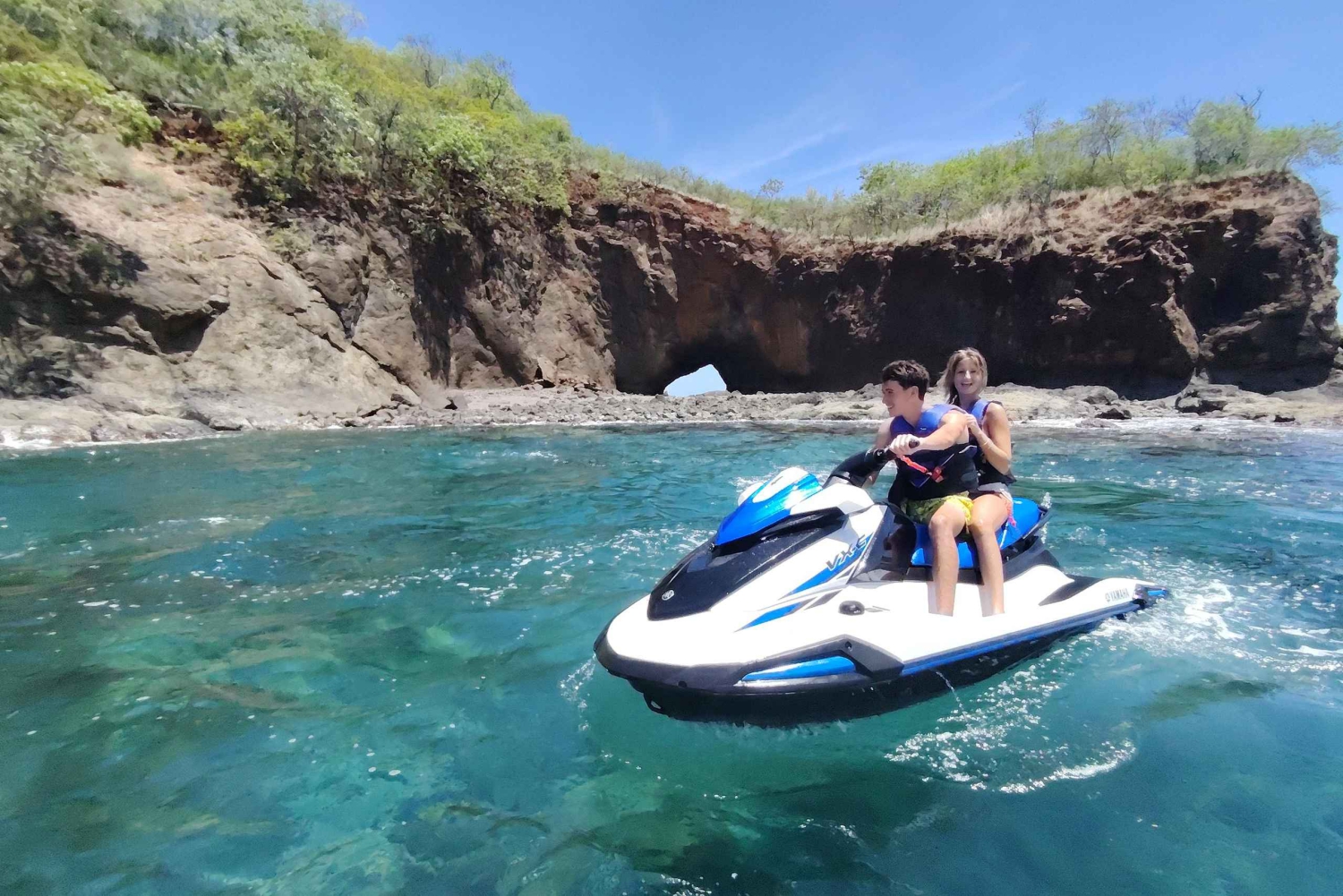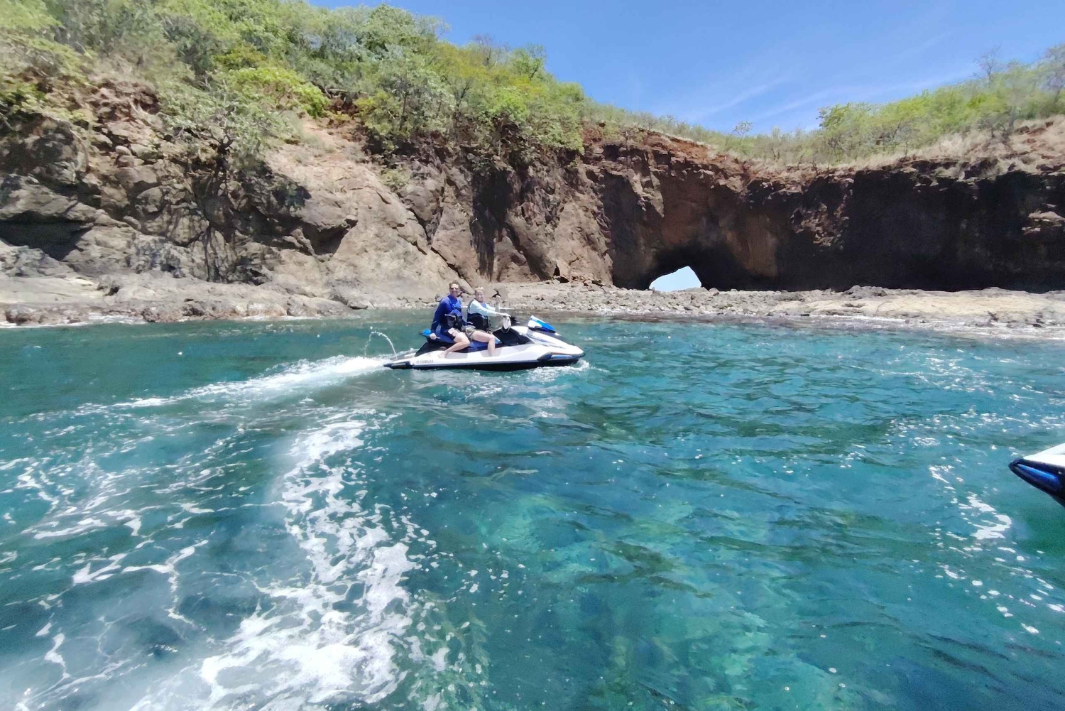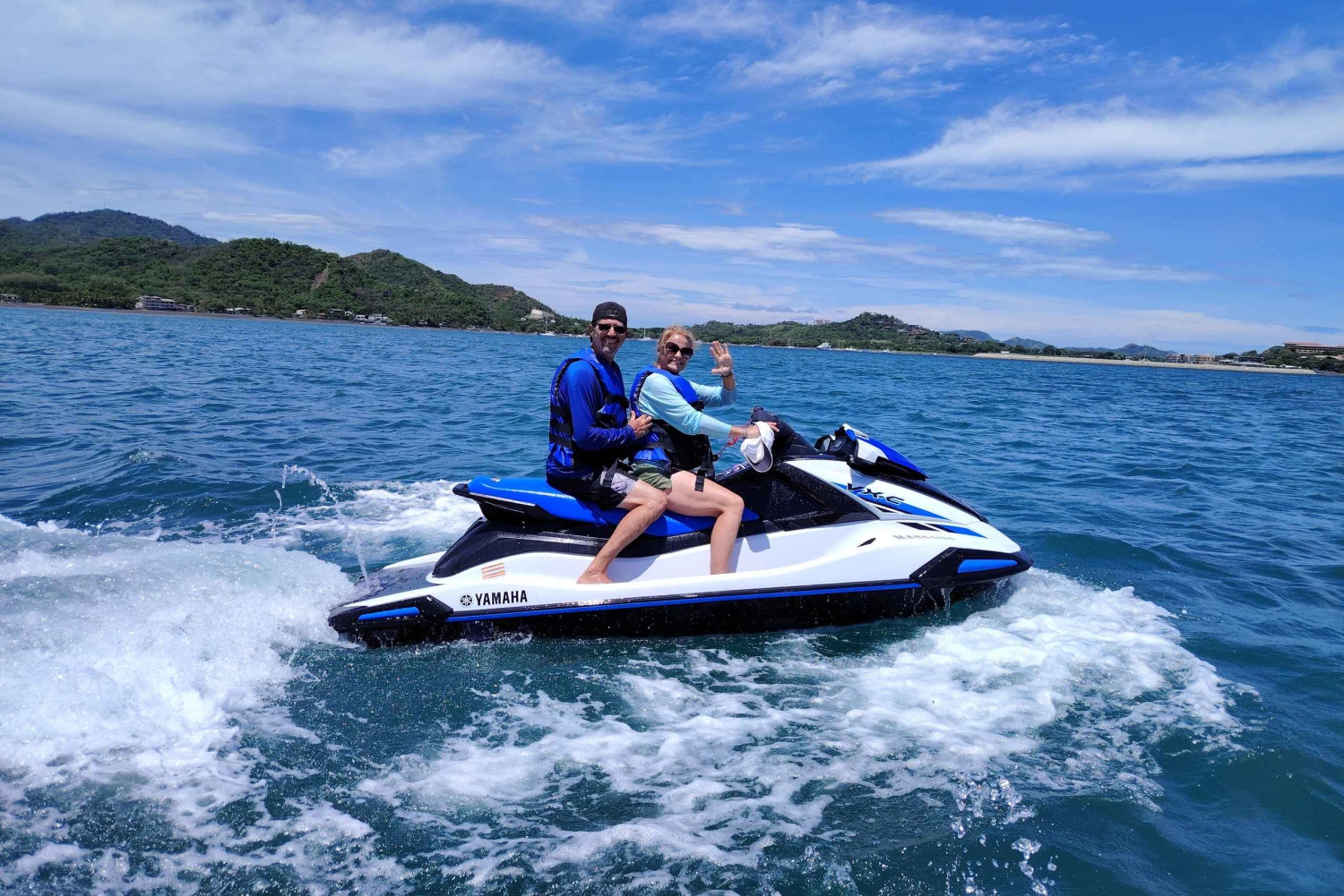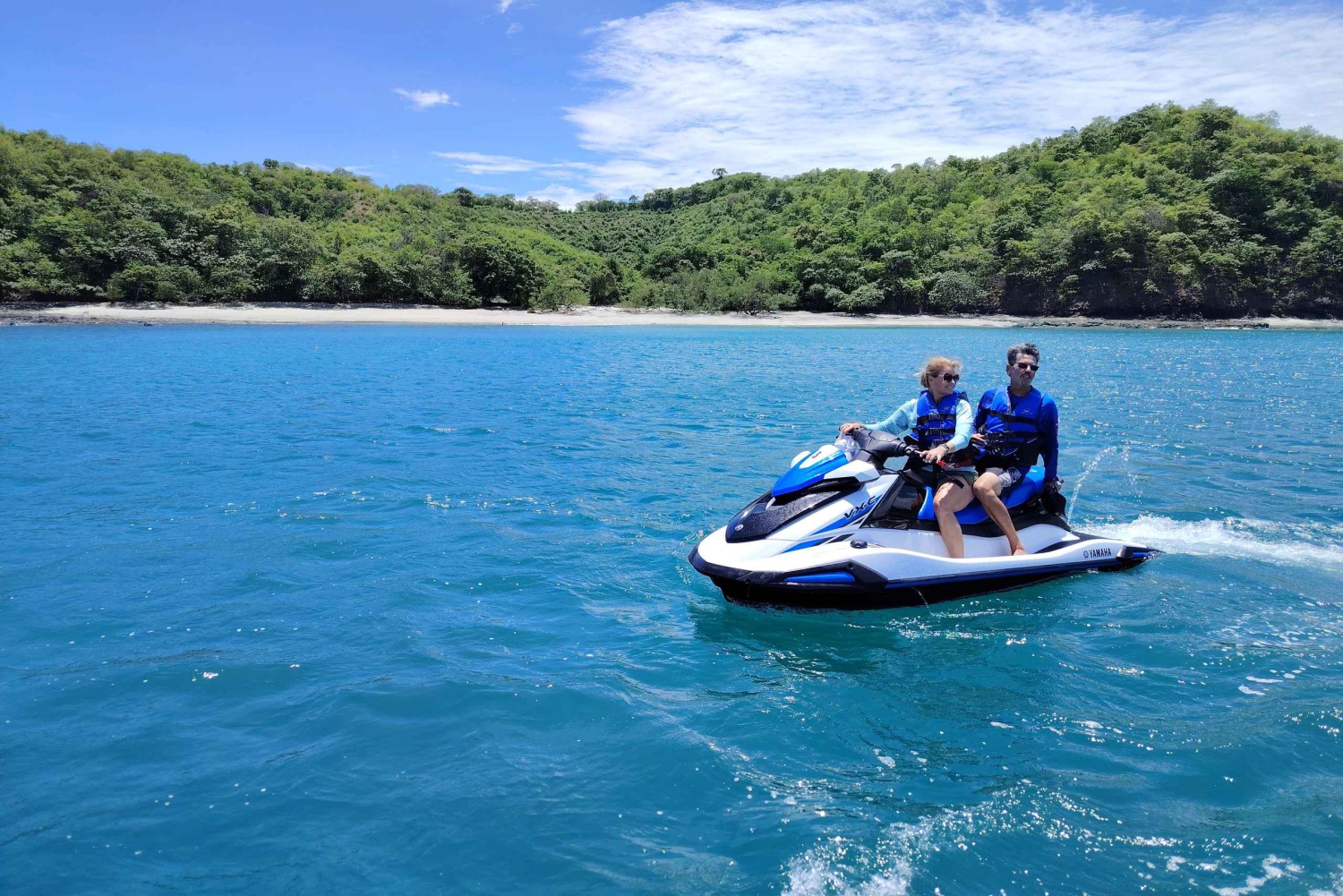 グアナカステ海岸沿いを、プラヤ・ココからプラヤ・パナマまで、プレミアムヤマハジェットスキーで疾走します。隠れた湾、海洞、火山島を探索し、クエレブラ湾の透明な海でスノーケリングをお楽しみください。