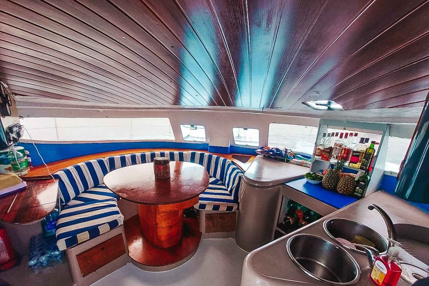 - Du vil bli fraktet med privat jolle fra stranden til katamaranen, ombordstigningsbrygge er ikke tilgjengelig. En kurv vil bli gitt slik at du kan legge igjen skoene dine siden du ikke kan ta dem om bord. Denne turen vil finne sted sol eller regn, men den vil bli kansellert hvis det er lyn eller stormer. Hvis vi kansellerer på grunn av dårlig vær, kan du legge om eller få full refusjon. Vi har plass til maksimalt 22 personer.