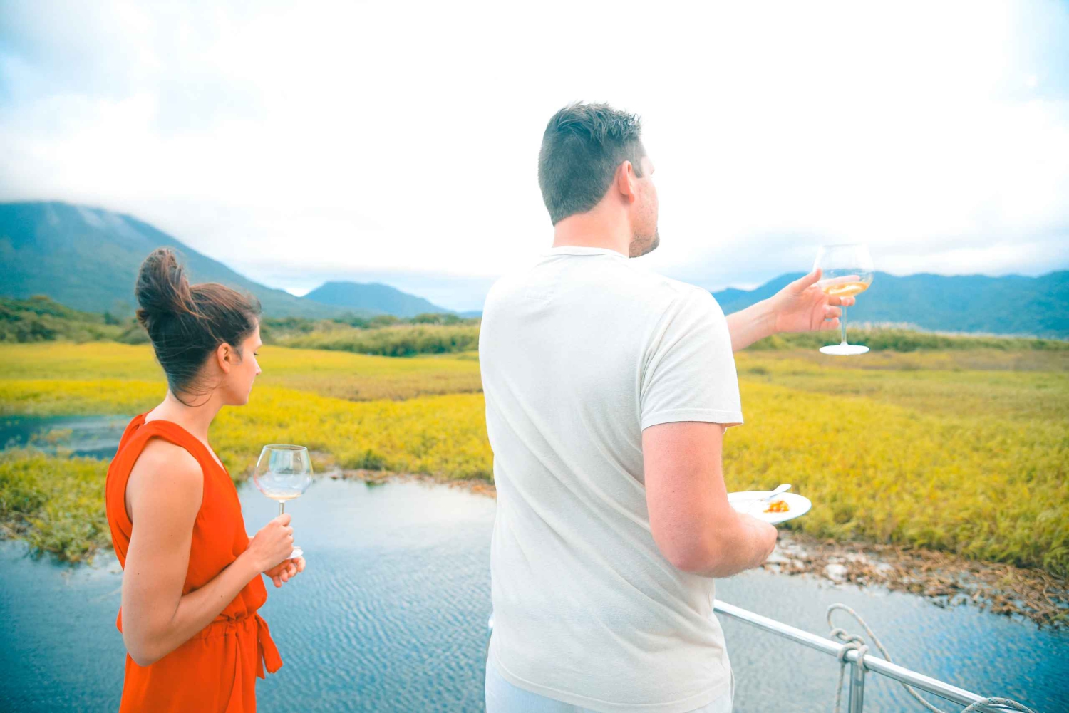 Nie przegap okazji, aby zobaczyć zachód słońca nad jeziorem Arenal. Po odebraniu z hotelu udaj się do małego miasteczka El Fosforo. Tutaj wejdź na pokład łodzi wycieczkowej i popłyń wokół brzegów jeziora, aby zobaczyć zimorodki, czaple i wiele innych. Odkryj ciche zatoczki, niesamowite życie ptaków i wspaniałe widoki na wulkan Arenal, jednocześnie dowiadując się więcej o okolicy od swojego przewodnika z pasją. Następnie usiądź wygodnie i podziwiaj spektakularny zachód słońca nad jeziorem i obserwuj, jak wulkan Arenal rozświetla nocne niebo. Napij się kostarykańskiego bimbru i zjedz lokalne przekąski, takie jak świeże chipsy i ser, obserwując to naturalne piękno. Na koniec wycieczki zostaniesz odwieziony z powrotem do hotelu.Includes