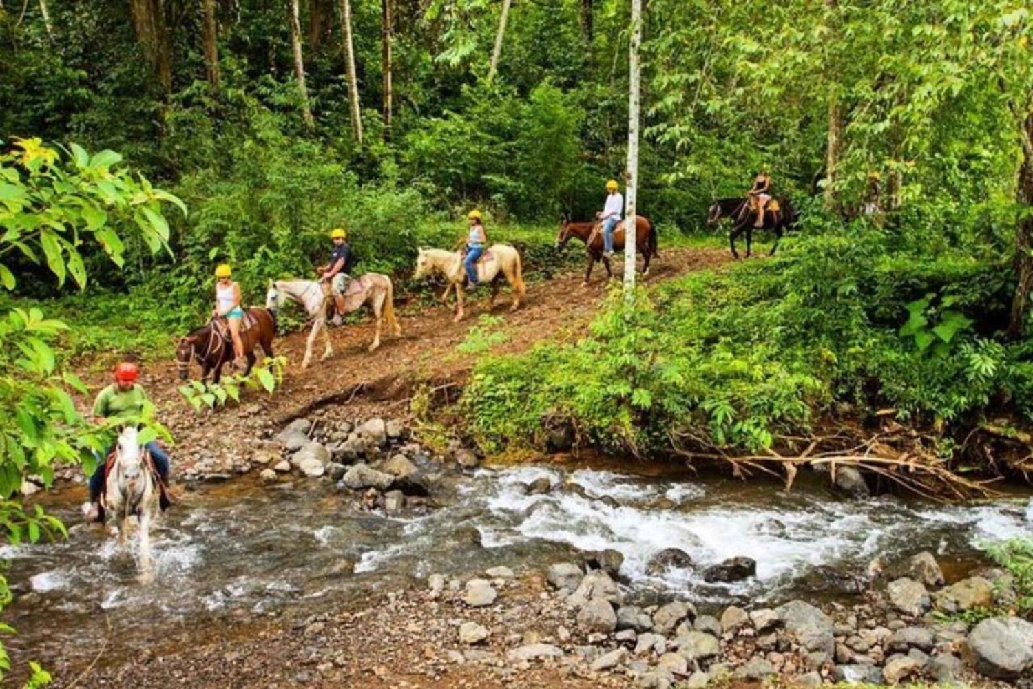 Embarque em uma emocionante aventura a cavalo de 1,5 hora saindo de Jaco em direção à exuberante selva da Costa Rica. Comece sua viagem com um conveniente serviço de busca no hotel que o levará ao Ocean Ranch Park, onde guias profissionais o receberão e selarão você em um cavalo de passo costarriquenho. Enquanto você cavalga pela densa floresta, fique de olho nos macacos de cara branca, tucanos e araras em seu habitat natural. A trilha leva você até a deslumbrante cachoeira El Encanto, de 180 pés. Sinta a névoa fresca da cachoeira enquanto você aprecia as vistas de tirar o fôlego da paisagem de floresta densa ao redor. Ao longo do caminho, admire os bosques de árvores antigas e as flores vibrantes que adornam a trilha. Sua aventura termina em um rancho em um vale remoto, onde você pode tirar os sapatos e relaxar. Você poderá saborear abacaxis frescos e uma bebida refrescante enquanto aproveita o cenário semelhante ao do Jurassic Park. Depois disso, você será levado de volta ao hotel, deixando-o com lembranças inesquecíveis de sua aventura na floresta tropical.Includes